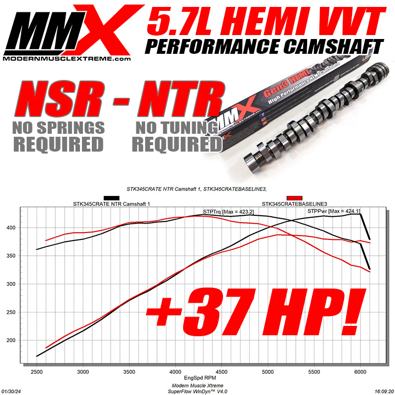 Introducing our 5.7 VVT HEMI NO TUNE REQUIRED NSR MDS Performance NA Camshaft! This camshaft is a true drop in, no tune required camshaft upgrade for your 5.7 VVT Hemi. does not require a Phazer limiter. Here at MMX we have spent countless hours of R&D on perfecting this camshaft and making it work with factory components. This camshaft has added 30 Wheel HP to our 2019 Ram 1500 5.7 Laramie, as well as a noticeable increase in low end torque. This cam works with the factory engine calibration***